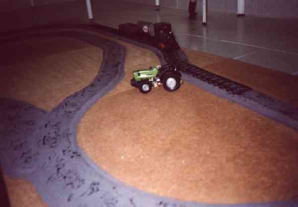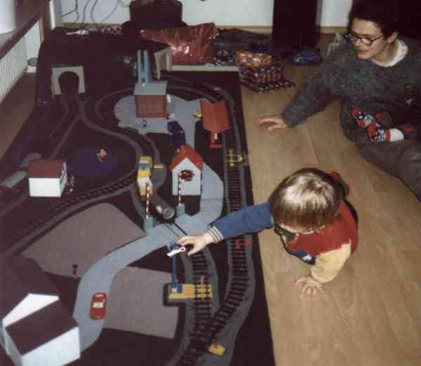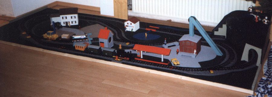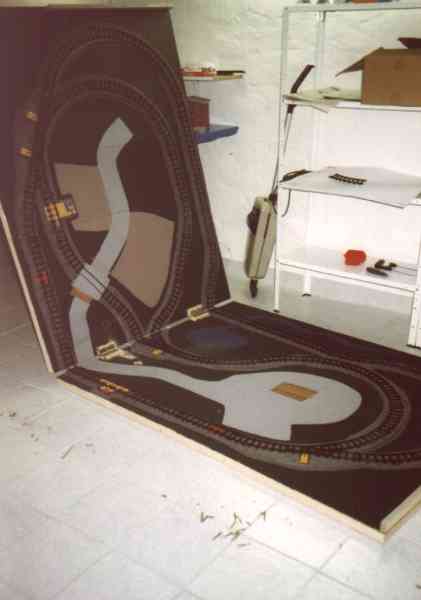 Da unsere Kinder schon sehr früh vom 'Eisenbahn-Virus' gepackt wurden (natürlich von mir tatkräftig unterstützt, u.a. durch die Überaschungsei-Bahn), musste über kurz oder lang auch eine kindgerechte Modellbahn ins Haus. Als wir dann eine Faller-Batterie-Bahn, bzw. die Reste einer solchen, erhielten, war das Weihnachtsgeschenk für dieses Jahr geklärt. Zufällig gab es in diesem Jahr Billig-Packungen mit Nachbauten aus alten Faller-Formen (unter den Schienen stand noch Faller) für sehr wenig Geld zu erwerben, sodaß wir einen relativ großen Gleisplan aufbauen konnten. Um das Ganze transportabel zu halten, wurde ein zweiteiliger Rahmen aus Dachlatten gefertigt, auf zwei mittigen Sockeln mittels Scharnieren verbunden und hierauf Hartfaserplatte befestigt, die als Geländeuntergrund diente. Hierauf wurde nun der geplante Gleisplan zusammengesteckt und mit dem 'Anreißzug' die Bettungskanten markiert.