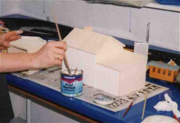 Zur Ausschmückung der bis dahin noch recht kahlen Platte bauten wir noch einige Gebäude aus Sperrholz; ein Bauernhof, ein Fischladen und ein Zechengebäude. zwei kleinere Gebäude wurden nach Maßen der Scharnierblöcke gefertigt, um diese im aufgebauten Zustand zu überdecken. Natürlich gehört zu einer richtigen Eisenbahn auch ein Tunnel, dieser entstand aus Dachlattenresten, Karnickeldraht und Pappmache.