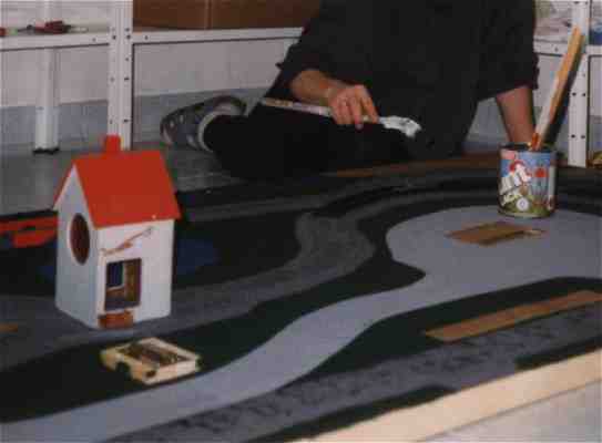 Die Bettung wurde aus 10mm starker Weichfaserplatte mit dem Cuttermesser schräg ausgeschnitten, mit Abtönfarbe grau und gesprenkelt eingefärbt und mit Schmelzkleber aufgeklebt. Als nächstes kamen die Schienen und die Gestaltung der 'Grünflächen' an die Reihe. Da die Kinder zu der Zeit 1 und 3 Jahre alt waren, kam es hier mehr auf Begehbarkeit, Abriebfestigkeit etc. an als auf naturgetreue Darstellung; also verzichteten wir vollständig auf Streumaterialien und malten Straßen, Wiesen und Wege einfach mit Acrylfarbe auf die Grundplatte auf. Die Kunststoffschienen wurden einfach mittels satter Schmelzkleberpunkte auf die Bettung aufgeklebt; im Bereich der Trennfuge nochmals seitlich verstärkt, um dann die Schienen zu teilen.