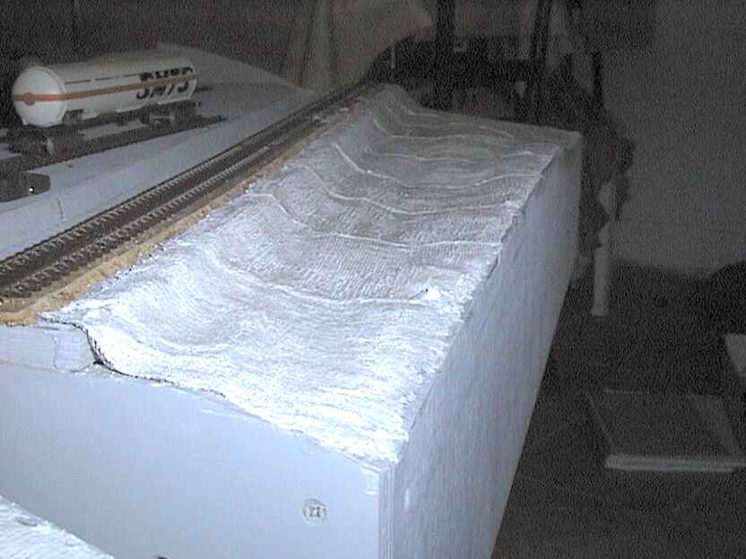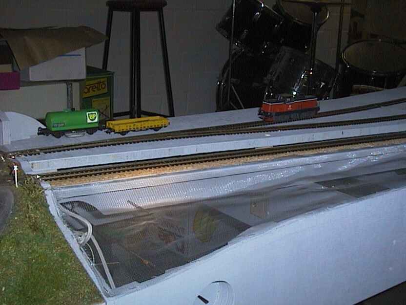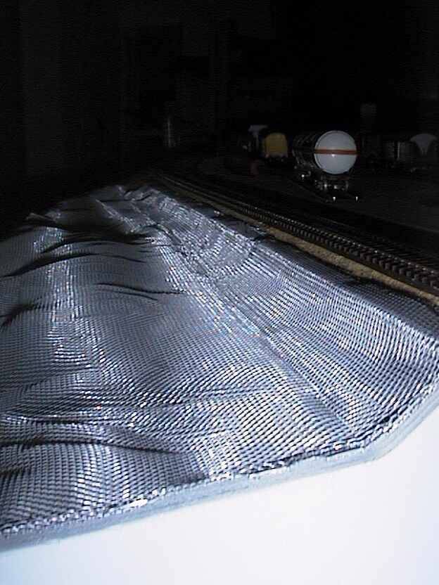 Der Unterbau besteht zunächst aus angetackertem Alu-Fliegengitter. Die waagerechten Flächen des Indutriegeländes werden mit Kork aufgefüttert.
