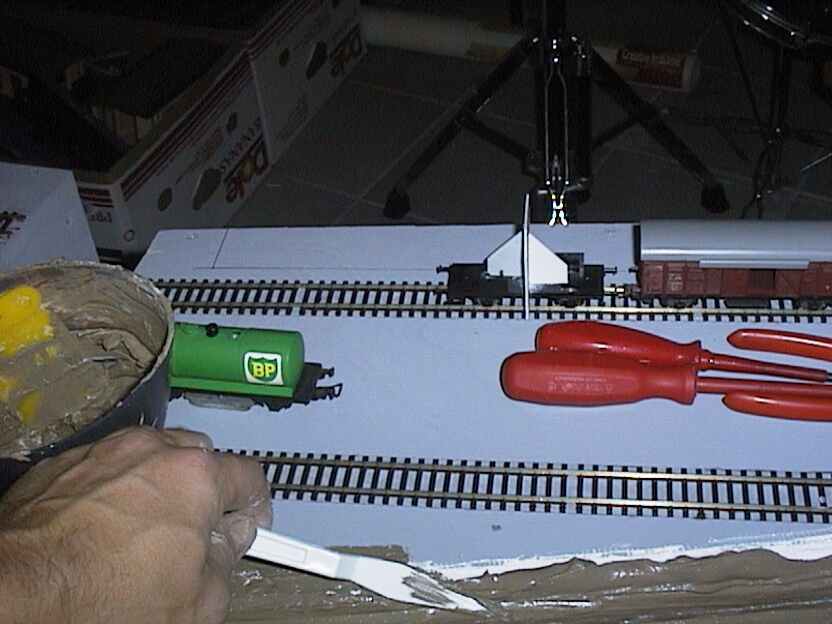 Mittels gefärbtem Ansetzgips wird die Landschaft eingestrichen und gestaltet.