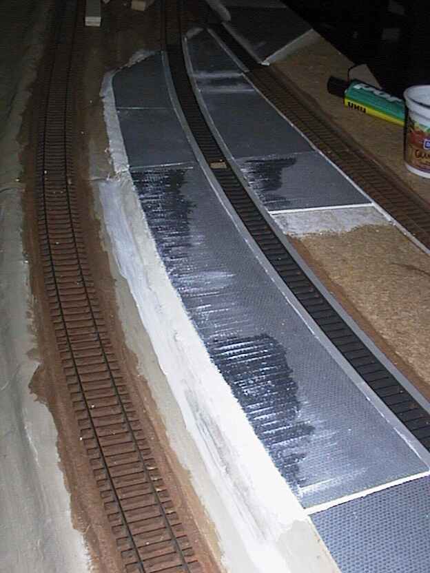 Die Kopfsteinpflaster-Styroporplatten werden relativ eng entlang der Fugen eingeschnitten, um den gebogenen Verlauf nachzubilden, und nach Anpassen der Kanten mit Styroporkleber aufgeklebt. Auch kleinere Stücke lassen sich so sicher fixieren, der Kleber ist noch einige Zeit justierbar und vermag einige Abstände zu überbrücken.