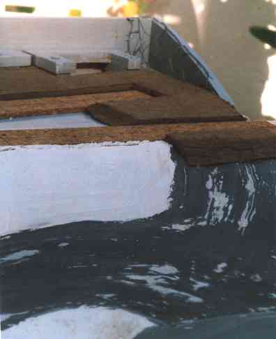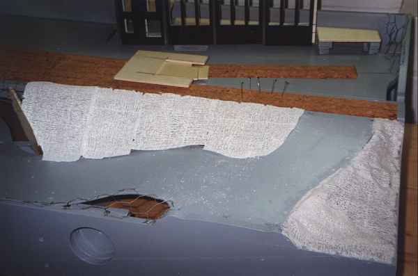Die Geländehaut erstelle ich mit einfachem Karnickeldraht, der grob in Form geschnitten an den Kanten angetackert wird. Über diese erste Stützkonstruktion lege ich streifenweise Stücke von Gipsbinden, die vorher 1-2 Sekunden in Wasser getaucht werden und nach dem Aufbringen an den Kanten glattgestrichen werden. Alternativ dazu probiere ich im oberen Bereich Schichten von grünem Styrodur aus dem Baumarkt, die mit dem Cuttermesser schräg abgeschnitten und mit Styroporkleber zusammengesetzt und aufgeklebt werden. Als letzte Rohbauschicht wird Fugenspachtel (zum Verspachteln von Gipskartonplatten) mit Wasser und brauner Abtönfarbe angerührt und aufgetragen. Durch die Farbe gibt es auch bei leichten Abplatzern keine allzu auffälligen weißen Stellen. Der Fugenspachtel hat eine sehr viel längere Topfzeit als gewöhnlicher Gips - d.h. man kann gut 15 Minuten mit einer angerührten Menge arbeiten. Außerdem reagiert Fugenspachtel nicht so allergisch auf Beimengung von Farben.
