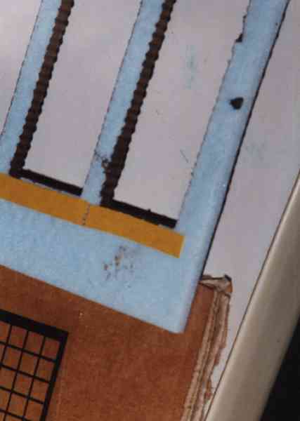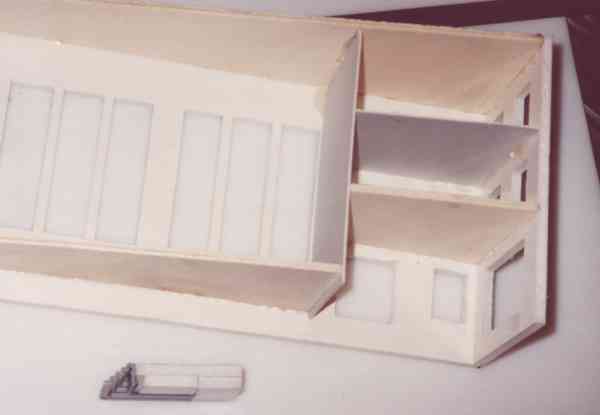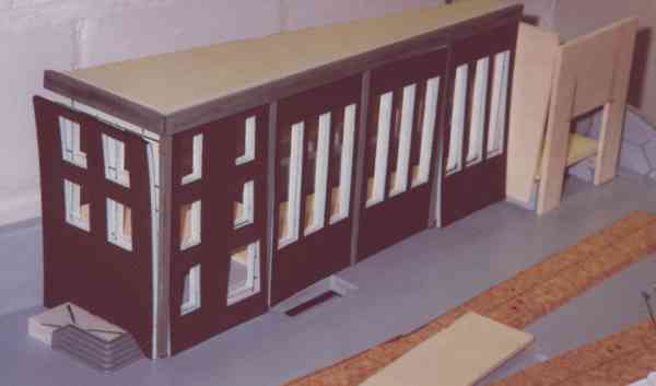Die Folienfenster und -rahmen klebe ich mit kleinen Streifen doppelseitigem Klebeband auf die Mauerplatten, um sie mittig an den Fensterausschnitten auszurichten. Aus Pappe schneide ich noch die Fensterbänke, färbe sie schwarz und klebe sie mit Sekundenkleber an. Damit werden zum Abschluß auch die Mauerplatten und Holzleisten abwechselnd auf den Rohbau geklebt. Zum Verstreichen des Sekundenklebers haben sich übrigens transparente Kabelbinder bestens bewährt; während Stecknadeln, Zahnstocher und andere Utensilien sofort festkleben, bleibt der Sekundenkleber am Kabelbinder einige Zeit nutzbar. Den Kern des Toranbaus säge ich zur Abwechslung mal aus Sperrholz, die Wellblechverkleidung ist einfache Wellpappe. Die ersten Stellproben ergeben, daß man trotz mattschwarzem Anstrich durch das geöffnete Hallentor den Hintergrund erkennt und so mit der Nase auf die geringe Tiefe des Gebäudes gestoßen wird. Eine zufälliger Blick in einem Industriegebiet läßt mich dann auf die Idee mit dem Kunststoffstreifen-Vorhang kommen, der die mangelnde Tiefe kaschiert. Zur Dacheindeckung verwende ich einfache Pergamentpapierstreifen, die überlappend auf das Dach geklebt und nach dem Trocknen mattschwarz angemalt werden. Um die Schnittkanten zu überdecken, klebe ich noch gefaltete Streifen aus dünnem Plastik umlaufend über die Kanten.