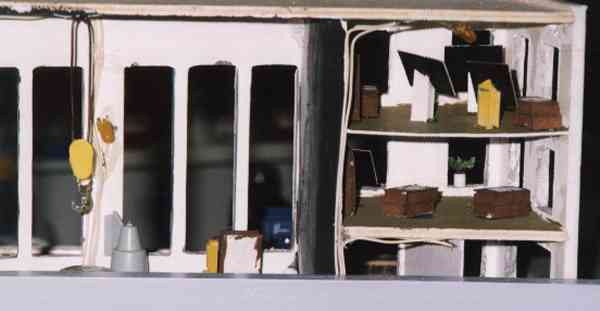 Bedingt durch die großen Fensterflächen wird auch eine Inneneinrichtung fällig. Als erstes werden Pappstücke als Zwischenwände und Geschoßdecken eingesetzt. Das gesamte Innenleben streiche ich nun - vor dem Zusammenbau - matt weiß (ein kleiner Rest Wandfarbe reicht völlig) und lege im Bodenbereich einen Farbverlauf nach schwarz hin an, um die geringe Tiefe zu verbergen. Schränke, Tische, Zeichenbretter und ähnliche Büroausstattung entstehen jetzt einfach und schnell aus irgendwelchen Reststücken, Detaillierung ist hier nicht gefragt. Für die Werkhalle selber kommt nun die Schrömmelkiste zum Einsatz. Aus dem reichhaltigen Fundus an Überraschungseierfiguren, kaputten Spielzeugautos, Lutscherstielen, Joghurtdeckeln u.s.w. entsteht nach und nach eine von außen gut wirkende Inneneinrichtung.
