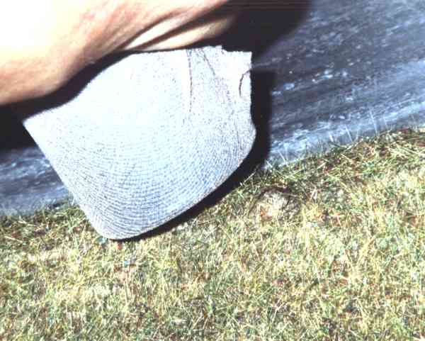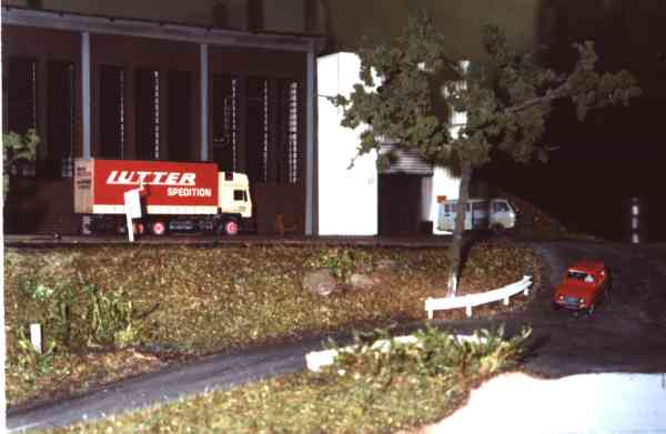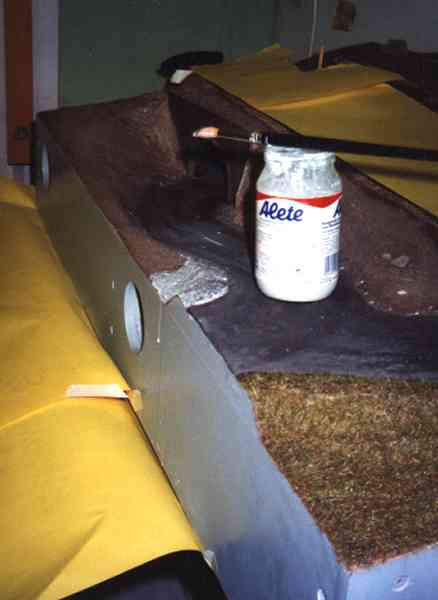 Den Grasflor schneide ich (beim Reißen zieht sich das Trägergewebe zusammen) in unregelmäßige Stücke und klebe ihn ebenso mit Weißleim auf. Die Ränder der Straße werden mit einem Sand-Lehm-Gemisch bestreut und nachher mit Weißleim-Wasser-Gemisch beträufelt. Kleine Büschel des abgefallenen Grasflors werden mit der Pinzette aufgenommen, kurz in Weißleim getunkt und hier und da passend angeklebt.