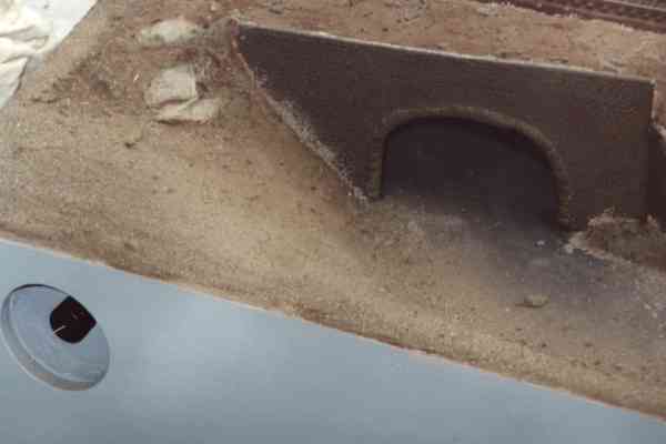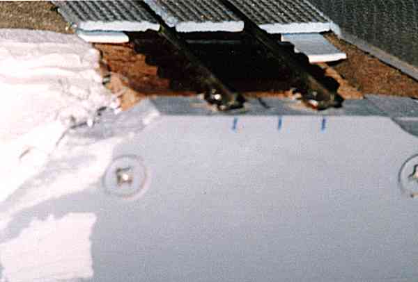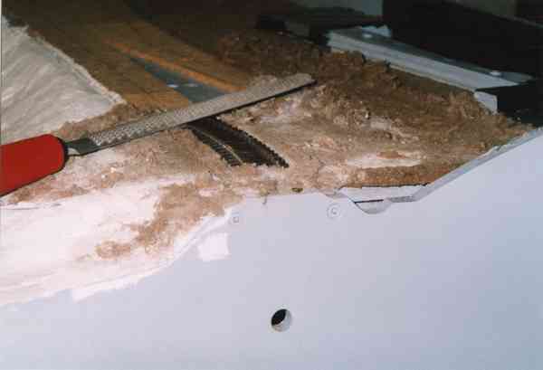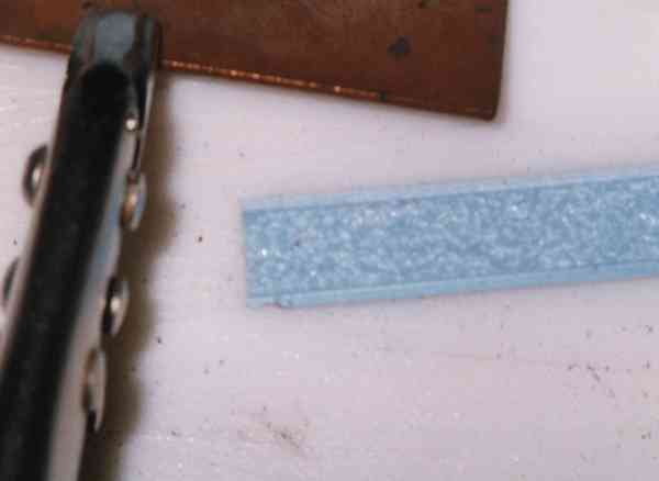 Nachdem die Kopfsteinplatten angepasst und aufgeklebt sind, überdeckt eine neue Spachtelschicht das Mißgeschick und schließt die Übergänge. Da die Styroporplatten etwas dicker sind als der Abstand Kleineisen-Schienenoberkante, müssen sie auf den ersten 3mm dünner werden. Dazu nehme ich ein 3mm-Kupferblech, erhitze es mit der Heißluftpistole und presse es gleichmäßig von hinten auf die Kante, sodaß der Styropor einschrumpft. Zwischen die Schwellen klebe ich passend geschnittene Styroporstreifen, und nach dem Trocknen wird der ganze innere Bereich mattschwarz angemalt. Darüber kommt ein witeres Stück Kopfsteinpflaster, an daß an den Längsseiten je ein rostfarben eingefärbtes Evergreen-Winkelprofil geklebt wird. Die Breite wird nach NEM-Norm festgelegt, damit kein Klemmen der Wagenräder auftreten kann.