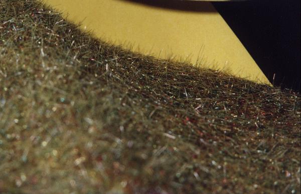 Als nächste Schicht bringe ich die Grasfasern auf. Dazu streiche ich jeweils einen Teilbereich mit nur wenig verdünntem Wasser-Weißleim-Gemisch satt ein und streue durch ein Plastiksieb die Streufasern auf. Mehr oder weniger senkrecht stehende Grasfasern erreiche ich, indem ein einfacher Luftballon durch Reibung mit einem altem Pulli statisch aufgeladen wird und über die frisch gestreuten Fasern geführt wird. Lose Fasern bleiben am Ballon hängen und werden über der Grasfläche wieder abgerieben; dabei entsteht sofort neue Aufladung. An besonders hartnäckigen oder unzugänglichen Stellen gehe ich kurz vor dem Aushärten des Weißleims mit dem Staubsauger (mit vorgespanntem Nylonstrumpf) über die Fläche.