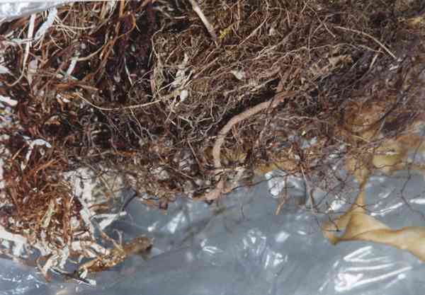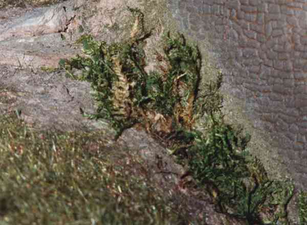 Für die weitere Geländegestaltung verwende ich allerlei hohen Grasflor, Moos aus dem Garten, Sand, Staub (von der Terasse gefegt) und sonstiges, gerade greifbares und passend erscheinendes Zeug. Auch die echte Natur lebt von der Vielfalt. Für kleinere Büsche, Stäucher und Klettergewächse verwende ich beim Sommerurlaub am Strand gesammelte Seetangstücke, die erst in Weißleim getunkt und dann in Laubflocken gewälzt werden. Mit unverdünntem Weißleim werden diese ebenso wie kleine Moosstücke an passender Stelle eingepflanzt.